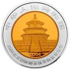 2004北京国际邮票钱币博览会纪念银币的正面内芯天坛采用了局部镀金工艺。