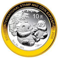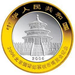 2006北京国际邮票钱币博览会熊猫加字银质纪念币正背面外环采用了镀金工艺。