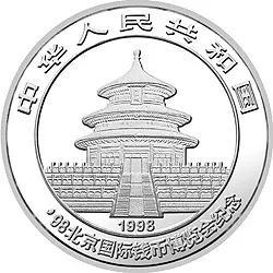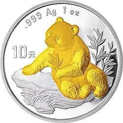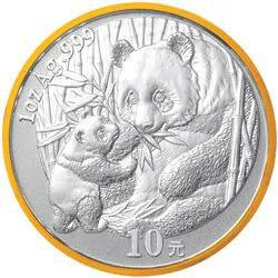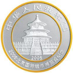 2005北京国际钱币博览会熊猫加字银质纪念币正背面清边及正面内圈圈边采用了镀金工艺。