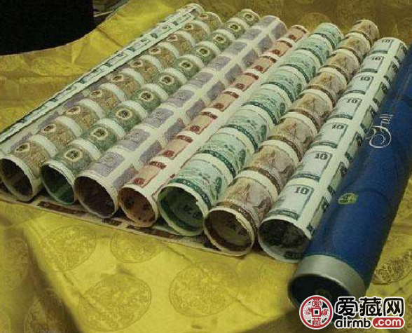 为什么叫这款藏品大炮筒呢?是因为它是整版钞,没有裁切,只能卷成桶才方便保存,久而久之就有了这个名字。第四套人民币整版钞大炮筒是经中国人民银行批准,授权中国长城硬币投资有限公司特别装帧设计的一款以第四套人民币整版张为主要内容的连体钞。它的总发行量为10000份。一万份的发行量大家就很直观了。这对于现在的人民币收藏圈来说可以说杯水车薪,奠定了后期升值的基础。