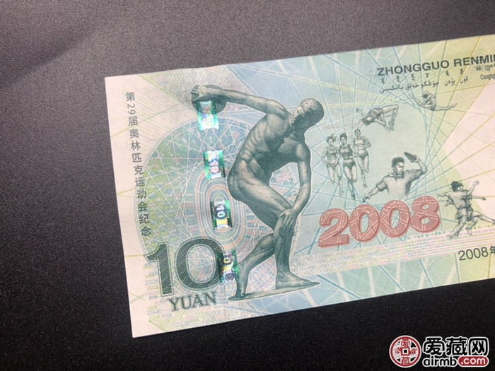 绿色奥运钞10元正面图案是2008年北京奥运会的鸟巢,一个标志性建筑,钞票的上方是一个红色的第二十九届奥林匹克运动会的会徽,仔细看会徽背面图案是北京的天坛,奥运钞的背面图案是一个古希腊的雕塑,雕塑中的图案是一个投掷铁饼的人,周围还有一些运动员的图案及2008的字样,这枚奥运钞在印刷和防伪技术上都非常出色,就这样一枚奥运钞的价格在短短几年内就从票面的10元上涨到上千元。