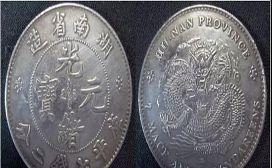 湖南省造光绪元宝七钱二分,光绪24年(公元1898年)铸,系湖南省委托英国伯明翰造币厂代铸样品,目前存世量不足10枚。