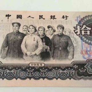 大团结10元纸币发行于1966年1月10日,1996年3月1日开始只收不付,2000年7月1日第三套人民币停止流通,正面图案为人民代表步入大会堂图,图案中我们可以看到不同阶级、不同民族的人民代表衣着朴素,正满怀喜悦之情的步入大会堂中行使自己的权利,而左上端还有蒙、藏、维、壮四种民族文字,正上方刊“中国人民银行”,左下角有十元汉语拼音字母,右上端有拾圆’字样,另外在左方中间还有天安门图案水纹印。而背面图案则选取了背两朵大红花包围的天安门,寓意着我国未来的好运,另外在上方还分别刊有中国人民银行的汉语拼音字母和中华人民共和国国徽。