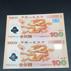 2000年,是华夏儿女为之自豪的“千禧龙年”,是中国钱币界捷报频传的一年。这一年的11月28日,中国人民银行首次发行了“迎接新世纪”100元塑料纪念钞一套。迎接新世纪纪念钞是中国历史上发行的第一套塑料连体纪念钞,由于塑料钞的制作工艺极其复杂,当今世界只有25个国家和地区发行过,故迎接新世纪连体纪念钞的问世标志着中国印钞工艺真正跻身世界最前列。现在就带大家一起了解下2000年龙钞双连体价格。
