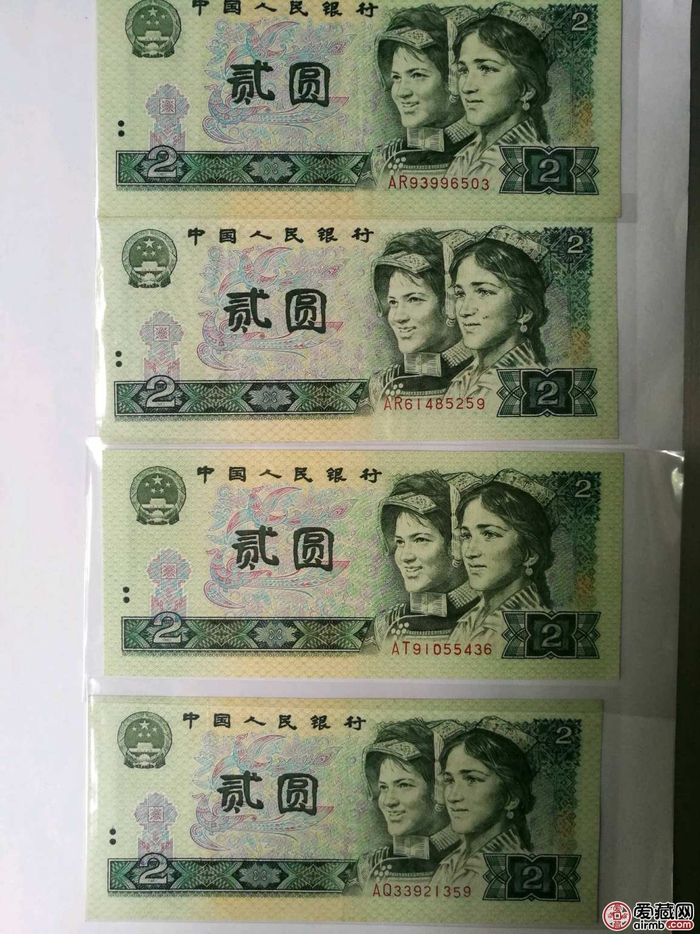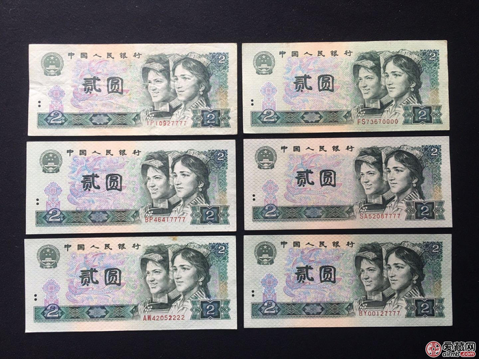 二、从号码上判断1980年2元人民币值多少钱。在收藏界里面,一般小号如AP00000001、AS00000001、IR00000001等的1980年2元纸币会比同等品相、同属冠号的价格高,甚至高数倍以上;同样豹子连号愈多如IZ88888888、IQ66666666、AP11111111、IU99999999等价格一般能超出纸币面值的千倍甚至万倍,在1980年2元人民币中,豹子连号ZG11111111、ZG66666666、ZG88888888等这样的一张纸币收藏价格在三万以上。