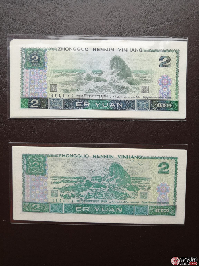 一、1980年2元人民币采用双凹生产工艺(即正、背面都凹印工艺印刷)。可以摸到它线条的手感的,头发,衣服都可以,凹版印刷是鉴别钞票真伪的最好方法。1980年2元人民币改为正面单凹印刷工艺(正面凹印工艺印刷,背面胶印工艺),两者对比就能看出。另外,80版2元颜色较深,90版2元颜色较浅。