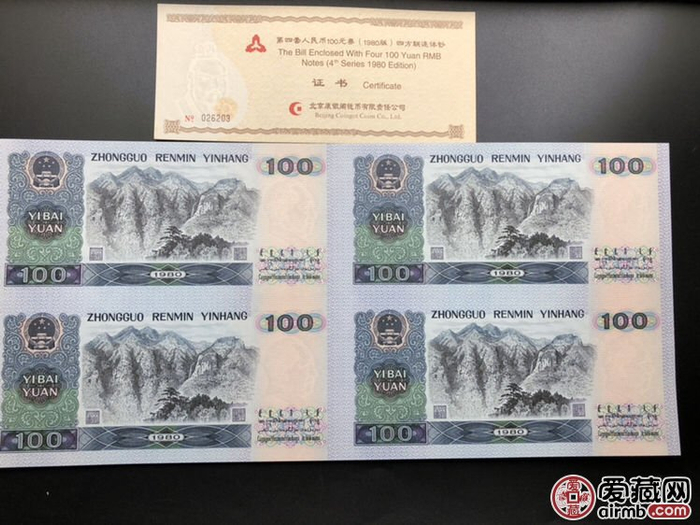 第四套人民币四方联连体钞100元,是中华人民共和国法定货币,由中国人民银行发行。该连体钞由4张未裁切的第四套人民币100元券(1980年版和1990年版)构成。中国人民银行授权北京康银阁钱币有限责任公司装帧,装帧量200,000套。