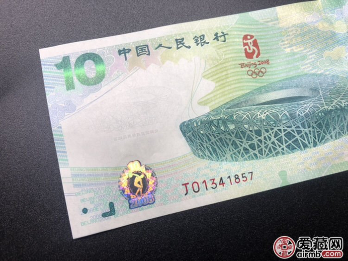 奥运钞10元纪念钞价格怎样的呢?2奥运钞10元纪念钞又被称为“绿钞”因为这张纪念钞整体色彩基调是绿色,其正面中间图案是2008年北京奥林匹克运动会的主会场——鸟巢,上方是奥运会的会徽,一个艺术字京,还有一个在奔跑的运动员,下面是奥运五环,再上面写着中国人民银行,这是对它的发行机构的标注,左上角写着10元,右上角还印制有庄严和国徽图案,反而是著名的古希腊雕塑——掷铁饼者,它右边是运动员的群体图案及红色字体的2008,右上方还有用拼音写着的中国人民银行及方向不同的面额标注。