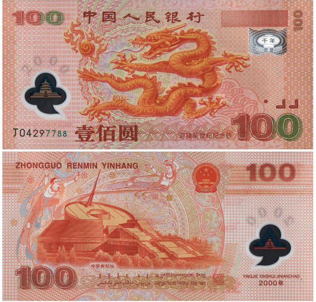 1千禧龙钞是塑料钞,透明视窗技术:钞票的左下角有一个透明窗口,窗口中是一个建筑物。将窗口对着光看过去,上面可以看见2000这个数字。