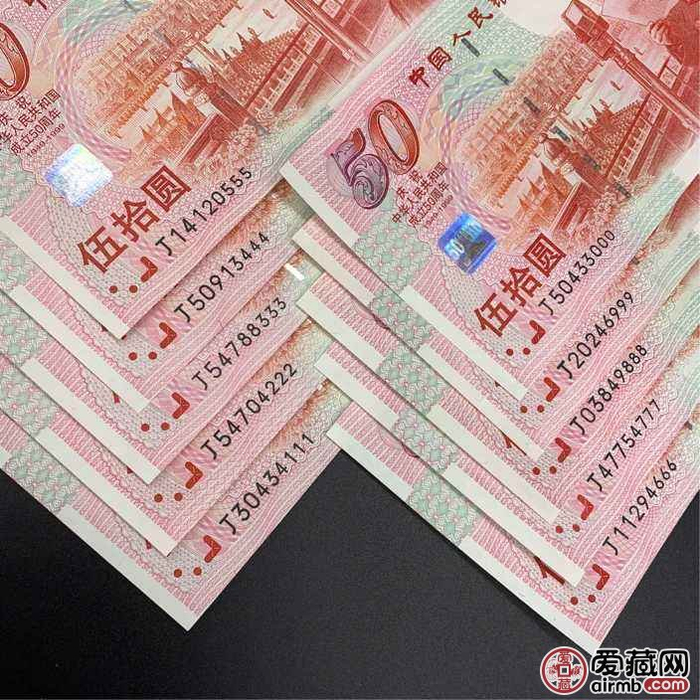 中国人民银行为了庆祝中华人民共和国成立五十周年,发行了建国五十周年纪念钞,该纪念钞主题鲜明,寓意深刻,制作技术高超,是我国第一套纪念钞,代表着我国当时钞票设计和印制技术的最高水平,具有十分重要的意义,建国五十周年纪念钞首次采用了多重的防伪标识,采用了动态全息防伪标识,在钞纸中应用了开窗式全息微缩文字安全线,首次采用冠字由大到小梯形排列,既增加了安全性又不失美感。目前距离建国五十周年纪念钞的发行已经过去了20年,相信很多入手建国五十周年纪念钞的藏家都非常好奇其价值,今天为你具体分析下建国五十周年纪念钞价格。
