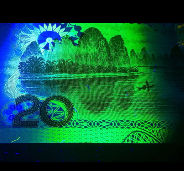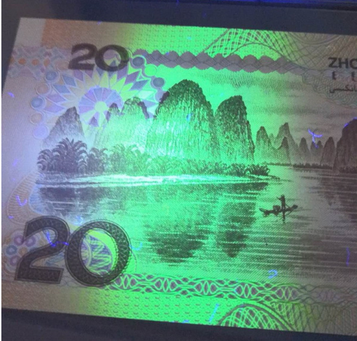 9920是除一版币20元以外,首次使用20元面值,意义重大,黄金叶的品种发掘于2018年6月,非常年轻!9920黄金叶是因为背面的特殊荧光而得名,背面左上角的太阳下边有三片金色的叶子,犹如黄金的铠甲!下边20面值边上有一条荧光的几何线体,好像一条金色巨龙!它与普通的9920对比是背面荧光面积非常宽,使得桂林山水甲天下的荧光效果更加亮丽!