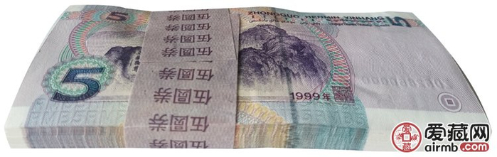 第五、从腰条颜色上判断1999年5元值多少钱,早期印刷发行的是花腰带的99版5元价格高,白腰条的1999年5元属于后期发行价格比较低,百连的相差每张两元左右,整捆的1999年5元相差3000元左右。