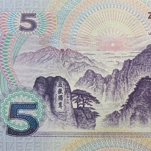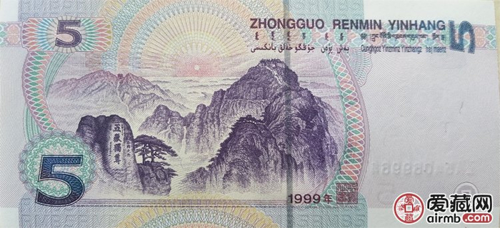 第二,99年版5元券背面的年号第一次使用了 "彩虹印刷"技术,这是一种文宇上的渐变印刷技术,难度很大,颜色上由紫到红进行渐变,如果不仔细看的话也可以看出明暗颜色的明显渐变,在低面额货币上出现实属难得。