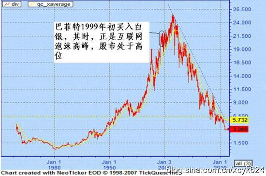 上世纪90年代末在全世界都在鼓噪互联网概念的时候,巴菲特却剑走偏锋,持续地大量买入白银,1999年初,巴菲特买入了1.3亿盎司的白银,在白银价格达到7.81美元/盎司的高位后,他又在白银的回调中不断加仓。在这个过程中,巴菲特买的并非最低价,卖的也更非最高价,过程中更出现接近20%的亏损。与此同时,其它科技股投资者的利益却轻松翻倍,巴菲特在强大的市场压力之下,依旧坚持追加白银头寸。这样看似飞蛾扑火的做法,无疑招致许多投资者的嘲笑,但巴菲特始终坚信自己的投资方向(说白了就是强行坐庄,依靠资金优势和自身优势!),最终完美收官,白银价格从5美元一盎司上涨至15美元一盎司,最多时,其头寸占到近一年的世界白银总产量,期货市场白银总持仓量的1/4。