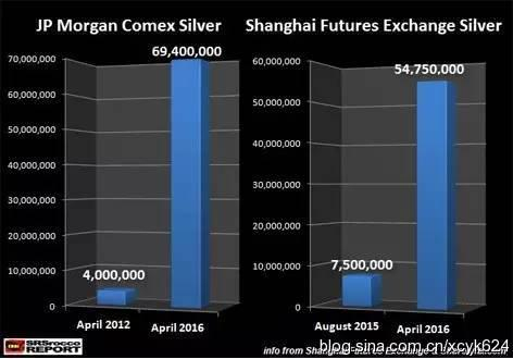 从2011年开始,摩根大通自己却开始储存越来越多的白银,到2016年4月,已经摇身一变成为全球除交易所和ETF基金之外最大的白银持有机构(下图是摩根大通与上海期货交易所的白银库存增长情况)……