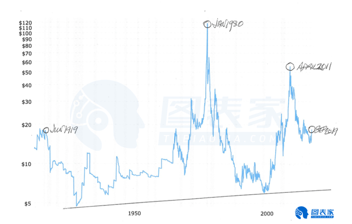 除了1974-84年和2010-14年这两段短暂的时期,过去一个世纪中白银一直低于1919年6月的水平。这意味着过去100年中有86年,白银价格处于较低的水平。