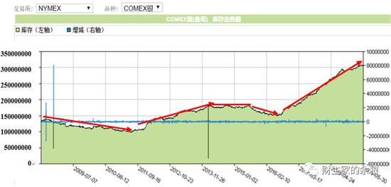 2011年6月-2014年2月,从0.95亿盎司一路上升到1.8亿盎司的水平,此后一直持续到2015年7月,白银库存基本保持在1.8亿盎司的水平;