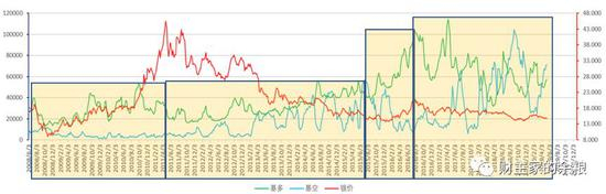 在阶段1,也就是2008-2011年上半年,因为白银库存处于较低水平且持续下降,对冲基金看空白银的仓位极低,一直都在1万手以下,相对而言看多仓位则逐渐抬高,正是这个原因,带来了银价的一路上涨。