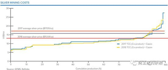说明:图中纵轴为白银全现金生产成本,而横轴则为白银原生矿的产能占比,蓝色曲线为2017年的情况,黄色曲线为2018年的情况,而橙色和灰色的横线分别是2017年和2018年的平均银价,红色横线是我特意画上去的13美元线。