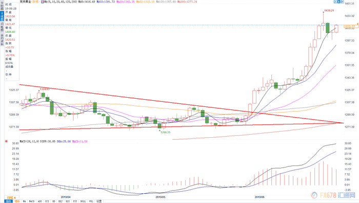 从黄金日图级别来看,黄金昨日打到1400关键水位后出现明显的反弹,并且收出十字星,表明下方关口支撑力度较强。目前,均线系统多头排列,表明多头趋势明显。前期60天线和120天形成金叉,短线上的拉回处于共振效应。从今天的k线来看,一旦确认为阳线,暗示多头调整已经完毕,行情将再度向上。狮子金融认为,黄金多头形态明显,确认调整完毕后可继续做多。