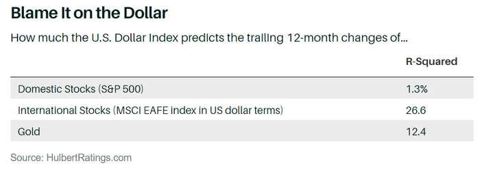 如上表所示,美指和美股之间的相关性相当低。胡尔伯特认为,这是可以理解的,因为标普500指数成份股公司对国际市场的依赖越来越大,海外投资对美股的影响也日渐增强。
