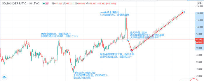 2020年:受COVID-19影响全球再次出现流动性恐慌,大量资金流入美元。白银两周暴跌30%,金银比创出历史高位120。全球央行此轮放水比08年更为猛烈,通胀预期很快回归,白银暴涨推动金银比回归。