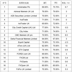 以下是36家受英国FCA授权许可的经纪商列表,以及2月份和7月份客户账户亏损百分比。