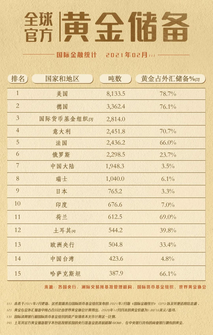 [1] 本表于2021年2月更新,列报了当时可用的数据。这些数据来自国际货币基金组织发布的 2021年2月版《国际金融统计》(IFS)以及其他适用信息源 。IFS数据滞后两个月,因此,显示的大多数国家黄金持有量是2020年12月的数据;部分国家数据收集时间更晚,其数据可能是2020年10月或更早时间的数据 。本表未列出所有黄金持有国:在过去6个月未向IMF报告黄金持有量的国家,以及那些虽然已知持有黄金但未公开报告其持有量的国家排除在外 。对于已知悉但未向国际货币基金组织报告的变动情况或印刷错误,世界黄金协会已作相应修改。