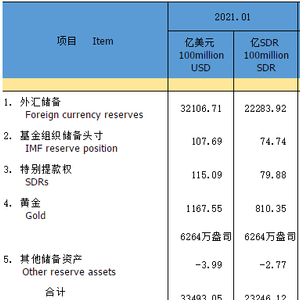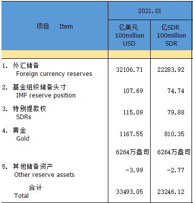 注:自2016年4月1日起,除按美元公布官方储备资产外,增加以国际货币基金组织特别提款权(SDR)公布相关数据,折算汇率来源于国际货币基金组织网站,其中2021年1月USD/SDR=0.694058。