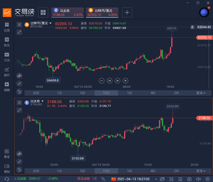 周二午后,比特币突破62000美元/枚,创历史新高;加密货币以太坊也突破2200美元/枚,刷新日高。