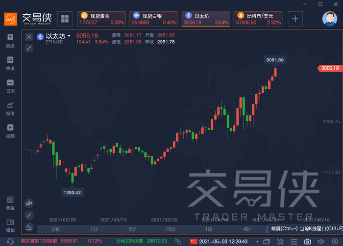 比特币和狗狗币在4月份都创下了历史新高,5月份似乎轮到以太坊发力了。周一(5月3日)亚盘,以太坊突破3000美元大关,再次创下历史新高。