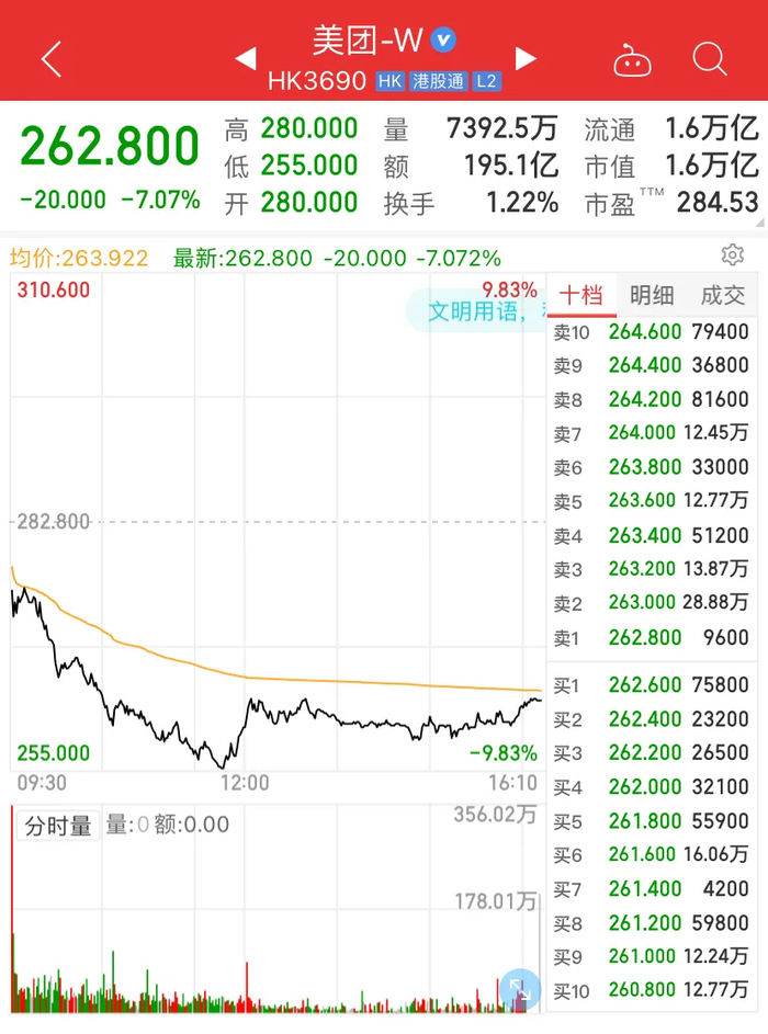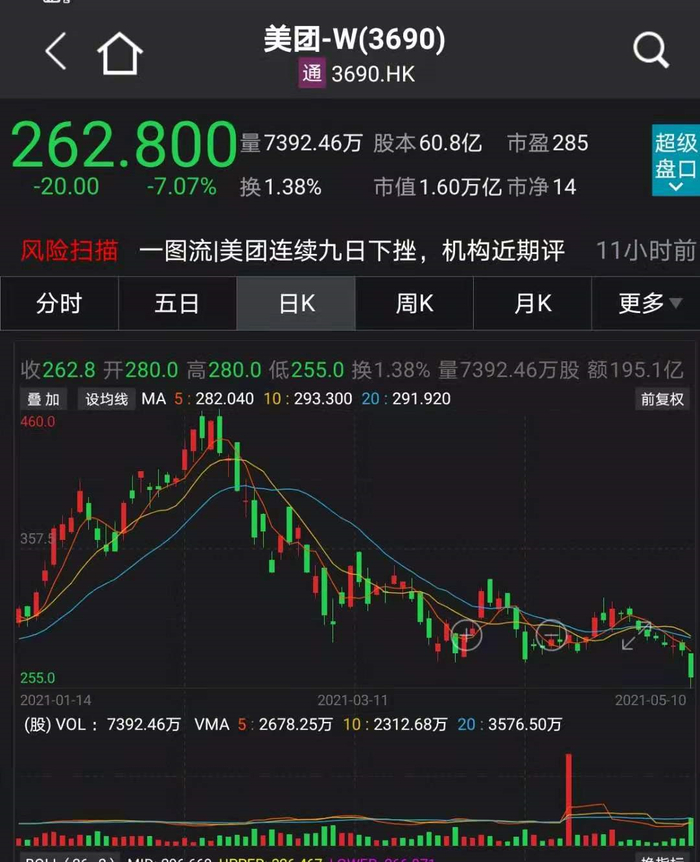 5月10日,美团股价再度重挫7.07%,盘中一度跌9.83%,逼近10%;从2月份460港元高位以来,美团的股价跌了近200港元,跌幅超40%,市值蒸发约1.2万亿港元。m晚间美股开盘,美团ADR跌超8%。