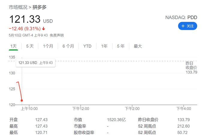 周一美盘,拼多多开盘跌近6%。