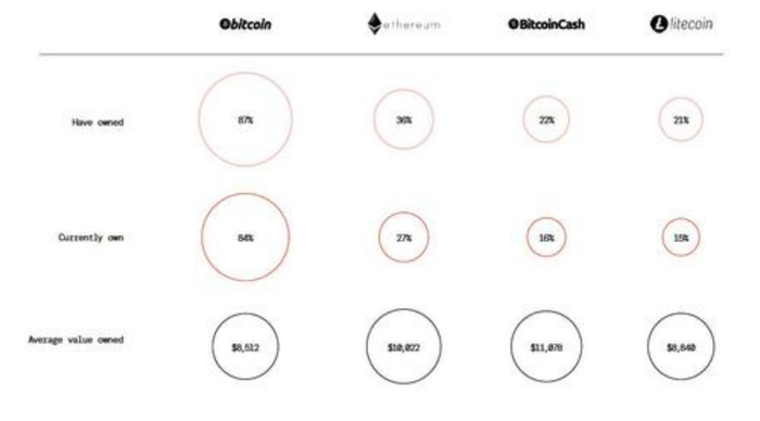 比特币仍是最著名的,也是最广泛持有的加密货币。目前,87%的加密货币所有者目前都购买或曾经购买过比特币,而以太坊只有36%,比特币现金22%,莱特币21%。而在持有比特币的投资者中,有84%的人表示他们愿意继续投资比特币,相比之下,在曾经投资过莱特币的受访者中,只有15%的人愿意持续持有。