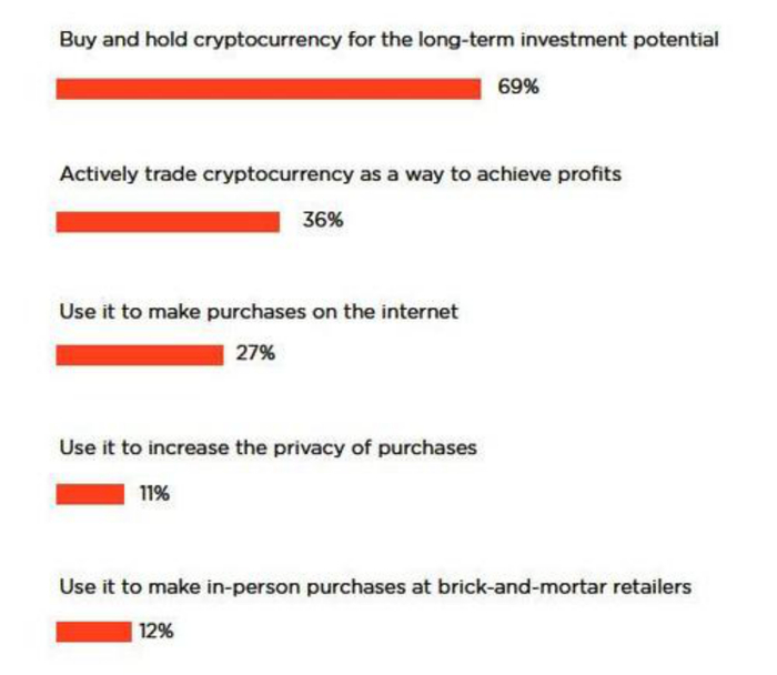 超过三分之二的投资者会长期持有加密货币。他们表示,购买和持有加密货币的原因是看中了它们长期的投资潜力,超过三分之二的人购买后没有再卖出,而只有36%的人是为了通过短期买卖赚取差价,使用它们来进行网上交易的人数更少,只占了27%。