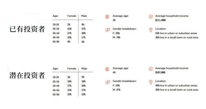 以下是加密货币的投资者画像。上面一栏是真正投资者的信息,下面一栏是未持有加密货币但是对其感兴趣的潜在投资者的信息。调查结果显示,加密货币的关注热度正在上升,对投资加密货币感兴趣的人数远远超过没有投资意愿的人数。