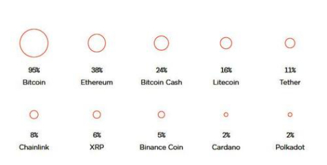 比特币已经成为了加密货币的代名词,受访者很少听过其他货币。绝大多数的加密货币持有者(95%)听说过比特币,但只有不到三分之一的人认识以太坊。