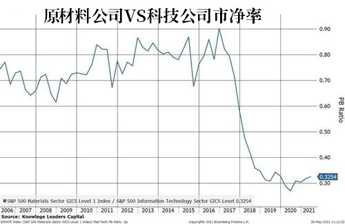 过去15年左右,美股最持久的趋势之一是,美国科技公司的表现相对强于基础材料公司。下图中的红线显示了原材料股与科技股的相对表现。自2005年至今,红线一直下降,意味着科技股表现好于原材料股;而蓝线则代表倒转的美元指数,随着科技股的表现好于原材料股,美元指数一直在上涨,直到最近才出现了扭转。