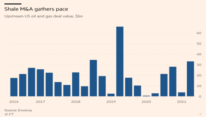行业咨询公司Enverus的数据显示,今年第二季度330亿美元的行业并购总额是自2019年第二季度以来最高的季度交易额,当时西方石油公司(Occidental Petroleum)以550亿美元收购了阿纳达科石油公司(Anadarko)。过去12个月里,随着该行业从一场因为疫情导致其财务严重受损的崩盘当中复苏,已经有超过850亿美元的并购交易完成。