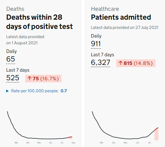 一个最明显的不安迹象是,在过去七天,英国新冠的死亡人数和住院人数并没有像确诊病例数那样出现下滑,依然出现了上升。这一背离现象依然令许多人感到揪心,同时也引发了对新冠确诊数下滑真实性的质疑。