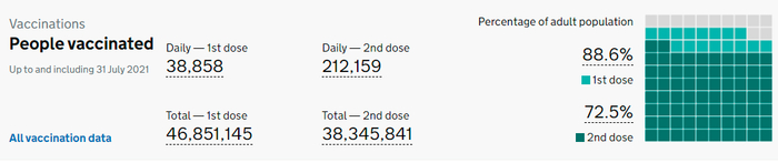 根据官方数据,截至当地时间上周六,英国一共有超过4685万人注射了第一针新冠疫苗,占成年人口比重的88.6%;超过3834万人完全注射了两针疫苗,占成年人口比重的72.5%。