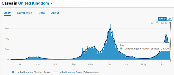 英国本轮疫情的高峰出现在7月17日,当时的单日新增确诊数曾达到逾54000例,超过了同期巴西、印度、印尼或南非报告的新增病例数,而目前这一数字已下降了逾五成。在解封“自由日”后,英国的单日新增新冠病例确诊数更是曾一度出现连续七天回落(7月21日-27日)。