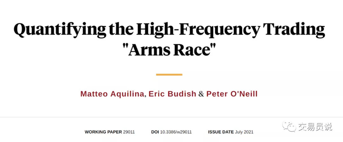 这一数据来自近期发表在《经济学季刊》上的一篇论文《Quantifying the High-Frequency Trading “Arms Race”》,该文作者是芝加哥大学商学院教授Eric Budish,英国金融市场行为监管局(FCA)的Peter O‘Neill、以及金融稳定委员会(FSB)的Matteo Aquilina。