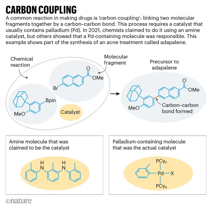 中国化学家在2021年报道了一项无钯反应,声称他们的碳耦合催化剂不含金属:只有一种称为胺的含氮结构的有机分子。问题是他们使用钯来制造胺催化剂。