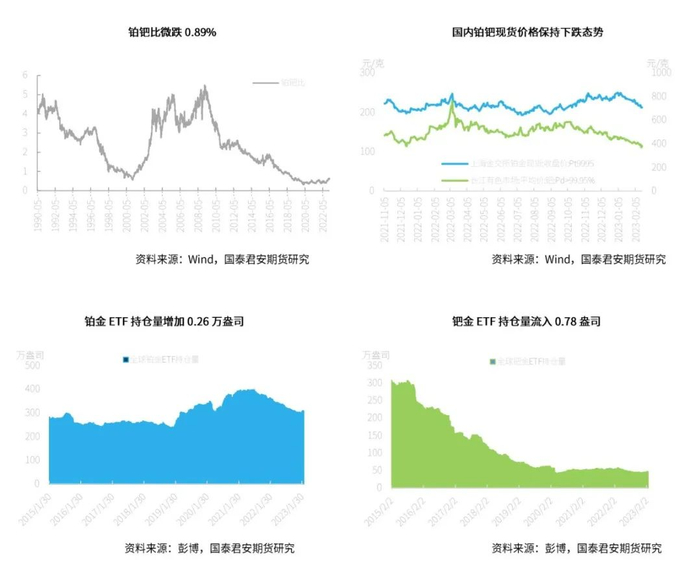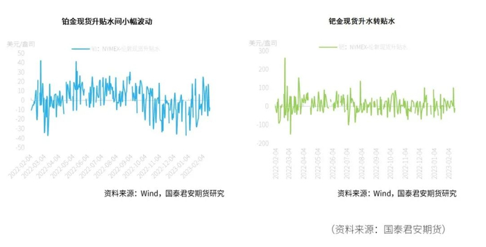截至2023年2月17日,本周NYMEX铂金库存和钯金库存均小幅流出。在现货升贴水方面,本周铂金现货升水贴水间小幅波动,以周五收盘价来看最终贴水7.80美元/盎司。钯金现货方面,本周由升水转贴水,最终贴水12.00美元/盎司。在ETF持仓量方面,铂金延续上涨态势,其全球ETF持仓量本周增加0.26万盎司,而钯金方面扭转上周流出态势,本周小幅流入0.78万盎司。