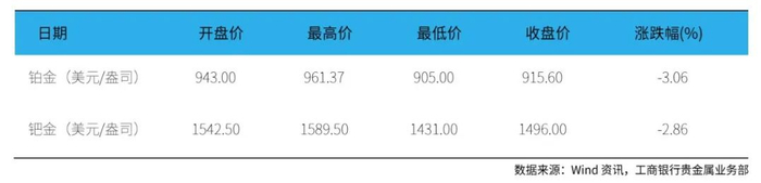 本周( 2月13-19日,下同 ),现货铂金开盘价为943美元/盎司,最高价为961.37美元/盎司,最低价为905美元/盎司,收盘价为915.6美元/盎司,周累计下跌3.06%。现货钯金开盘价为1542.5美元/盎司,最高价为1589.5美元/盎司,最低价为1431美元/盎司,收盘价为1496美元/盎司,周累计下跌2.86%。