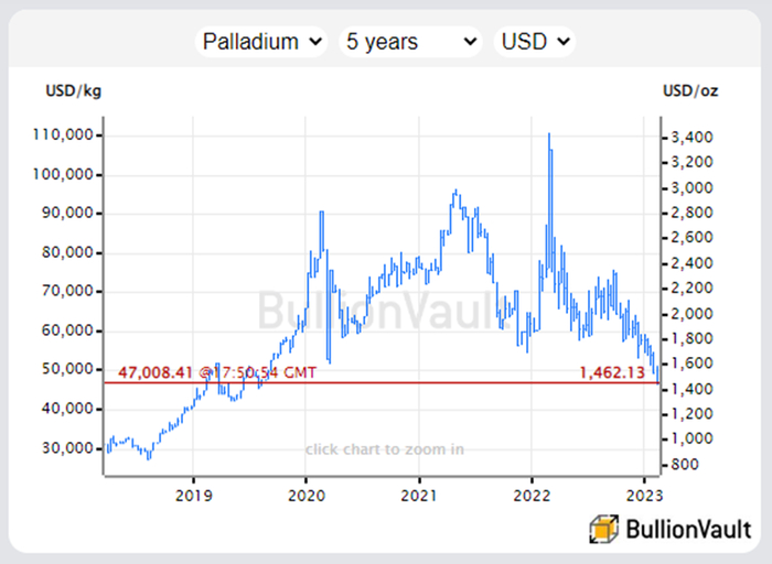钯金上周三跌至1450美元/盎司附近,这是2019年9月以来的最低价格,也是金属聚焦(MetalsFocus)铂族金属专家Wilma Swarts预测的2023年价格低点,原因是“越来越多的人意识到,2024年以后市场将出现过剩状况”。