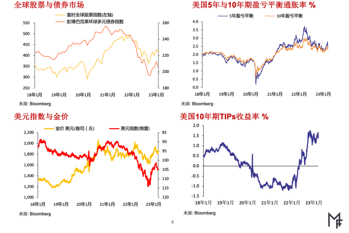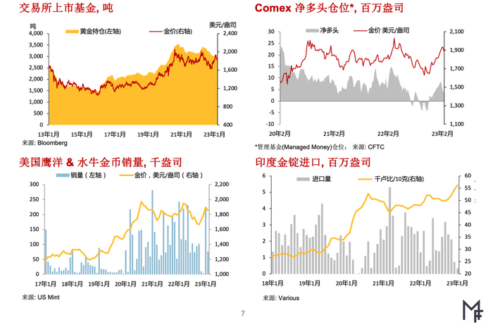 在这一大背景下,我们认为贵金属价格在最小阻力路径下仍大致呈下行走势。因此即使对最终利率达到6%的预期落空,我们仍预期今年上半年美联储将继续加息,或将在5.5%左右见顶。此外,虽然仍存在通胀上行风险,但鉴于高基数效应,我们认为2023年期间通胀将回落。
