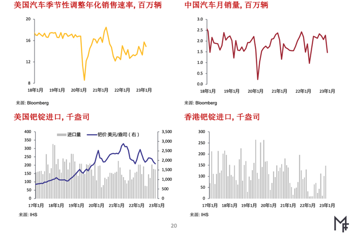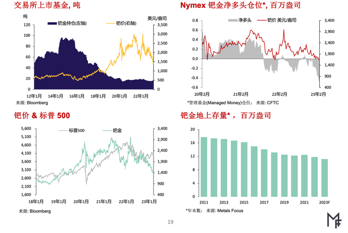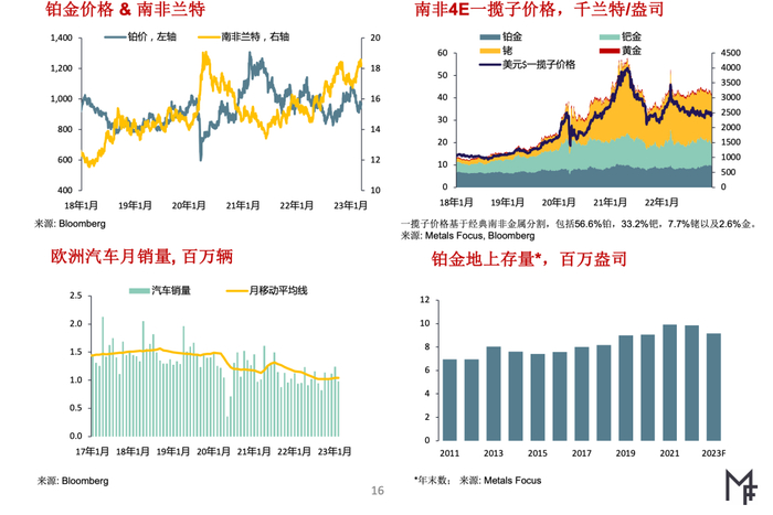 预计2023年回收钯金供应量将同比增长10%,至305万盎司。从废汽车催化剂中回收再生的钯金数量有望上升12%,是增长主要推手。虽然供应量将较2022年增长,但仍低于2019-2021年期间的水平,背后的原因包括:新车销量低和旧车行驶里程数低导致报废汽车供应量下降,令废汽车催化剂供应链继续承压;价格下跌导致回收商惜售回收的材料;美国司法部采取干预措施后回收程序日趋严格,导致供应放缓。