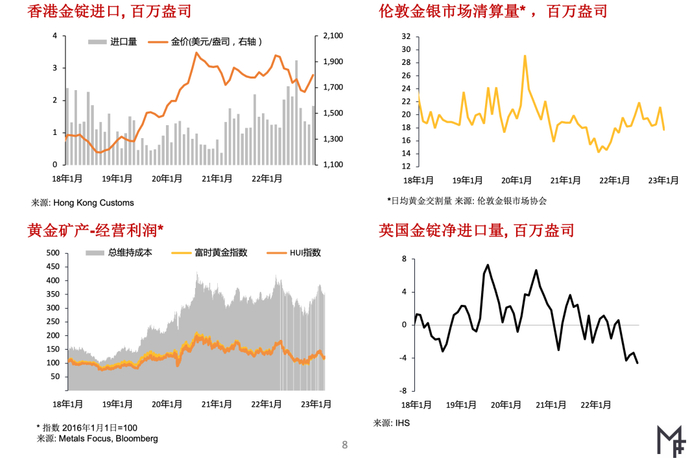 中东地区,因2022年全年黄金进口量已达379吨后,2023年1月份进口量月增幅继续创出新高,达83吨,土耳其政府采取了干预措施,在2月中旬后实施新法规,以减缓进口,从而遏制抑制贸易逆差扩大。以美元和土耳其里拉结算的国内金价溢价幅度曾分别飙升至20-25美元/盎司和40美元/盎司左右,目前回落至10-15美元/盎司和20美元/盎司。